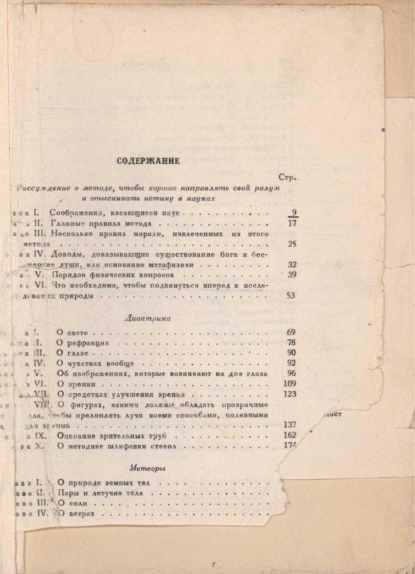Рассуждение о методе : с приложениями Диоптрика, Метеоры, Геометрия / редакция, перевод, статьи и комментарии Г. Г. Слюсарева и А. П. Юшкевича. - Москва : Издательство АН СССР, 1953. - 656 с., [3] отд. л. ил. : ил. ).