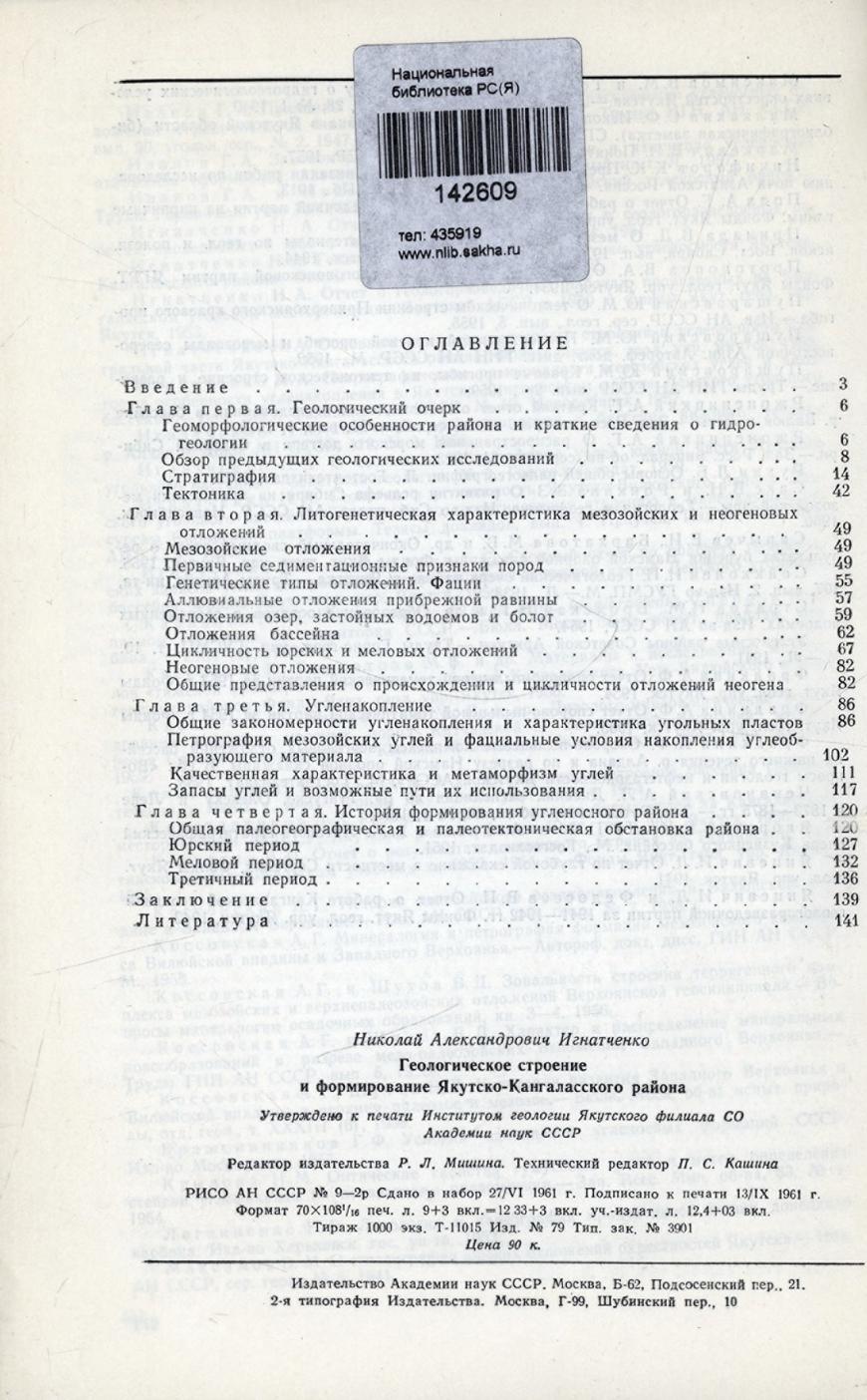 Геологическое строение и формирование Якутско-Кангаласского района : (Ленский угольный бассейн) / Н. А. Игнатченко ; ответственный редактор Н. В. Черский ; Академия наук СССР, Сибирское отделение, Якутский филиал, Институт геологии. - Москва : Издательство Академии наук СССР, 1961. - 144 с.