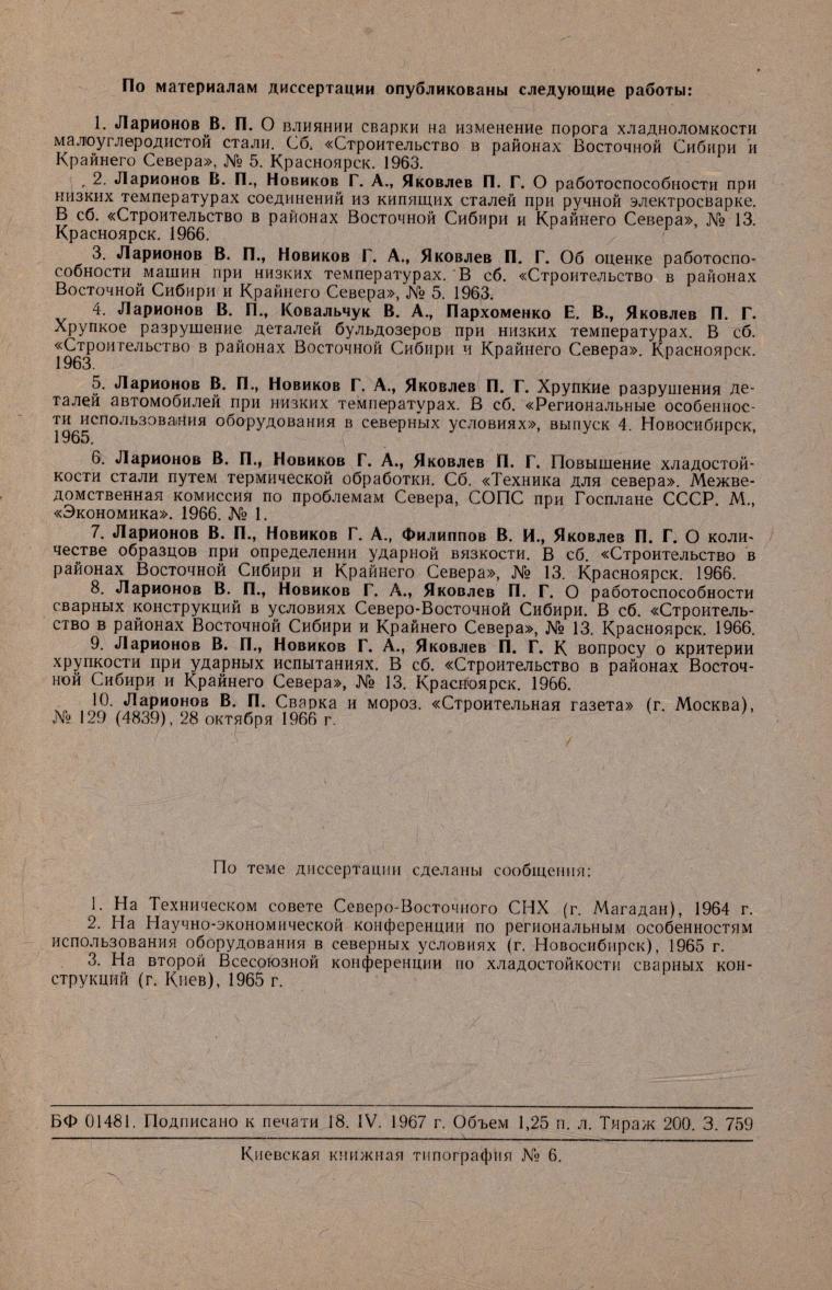 Хрупкое разрушение сварных соединений в условиях Северо-Востока СССР : автореферат диссертации на соискание ученой степени кандидата технических наук / В. П. Ларионов ; научный руководитель Б. С. Касаткин ; Академия наук УССР, Институт электросварки им. Е. О. Патона. - Киев, 1967. - 15, [2] с.
