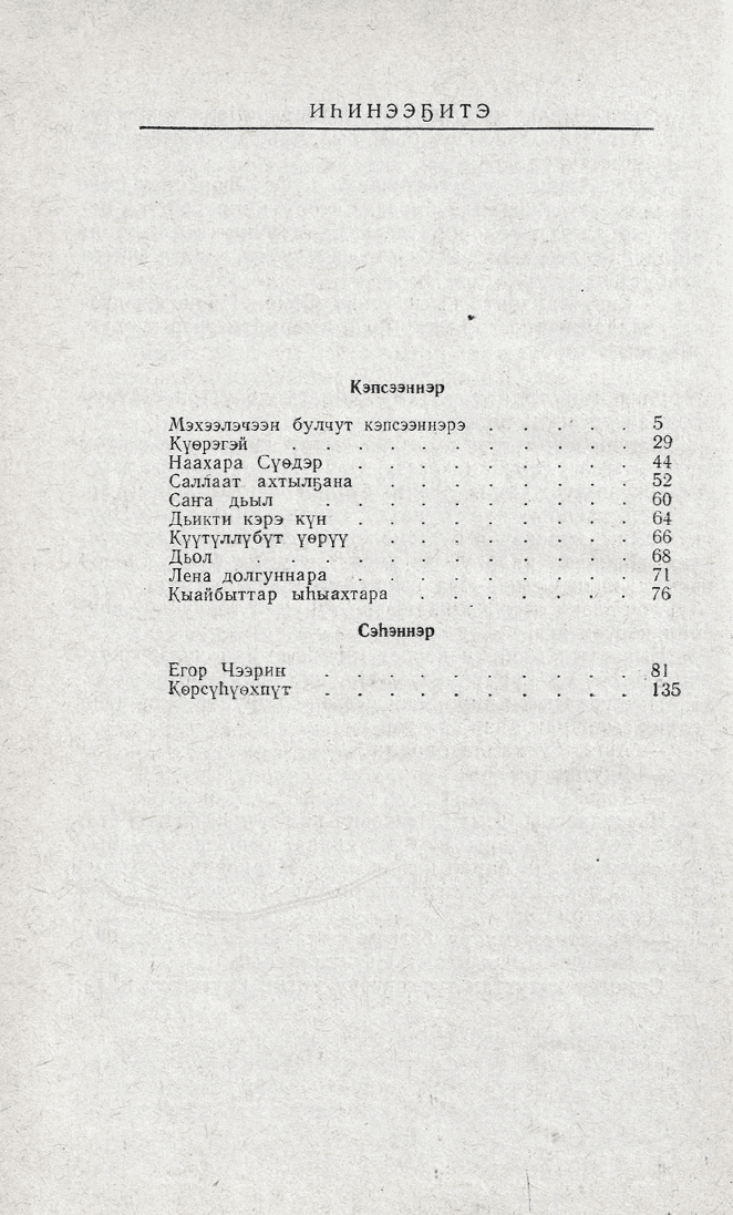 1979 с. «Кинигэ издательствота» бэчээттээн таһаарбыт «Көрсүһүөхпүт» диэн кинигэтигэр оҕолорго анаан суруйбут «Мэхээлэчээн булчут кэпсээннэрэ», «Күөрэгэй» остуоруйата, «Наахара Сүөдэр», «Саллаат ахтылҕана», «Саҥа Дьыл», «Дьикти кэрэ күн кэпсээннэрэ», «Күүтүллүбүт үөрүү», «Дьол», «Лена долгуннара», «Кыайбыттар ыһыахтара» диэн кэпсээннэрэ, «Егор Чээрин» уонна «Көрсүһүөхпүт» диэн сэһэннэрэ киирбиттэр.