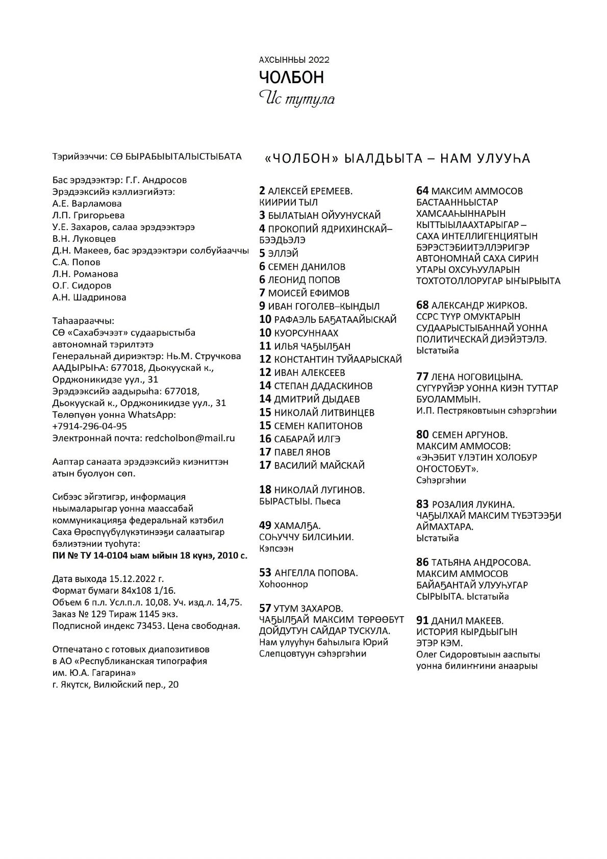 Чолбон : [уус-уран литературнай уонна общественнай-политическай сурунаал] / Саха Өрөспүүбүлүкэтин Бырабыыталыстыбата. - Дьокуускай, 1999