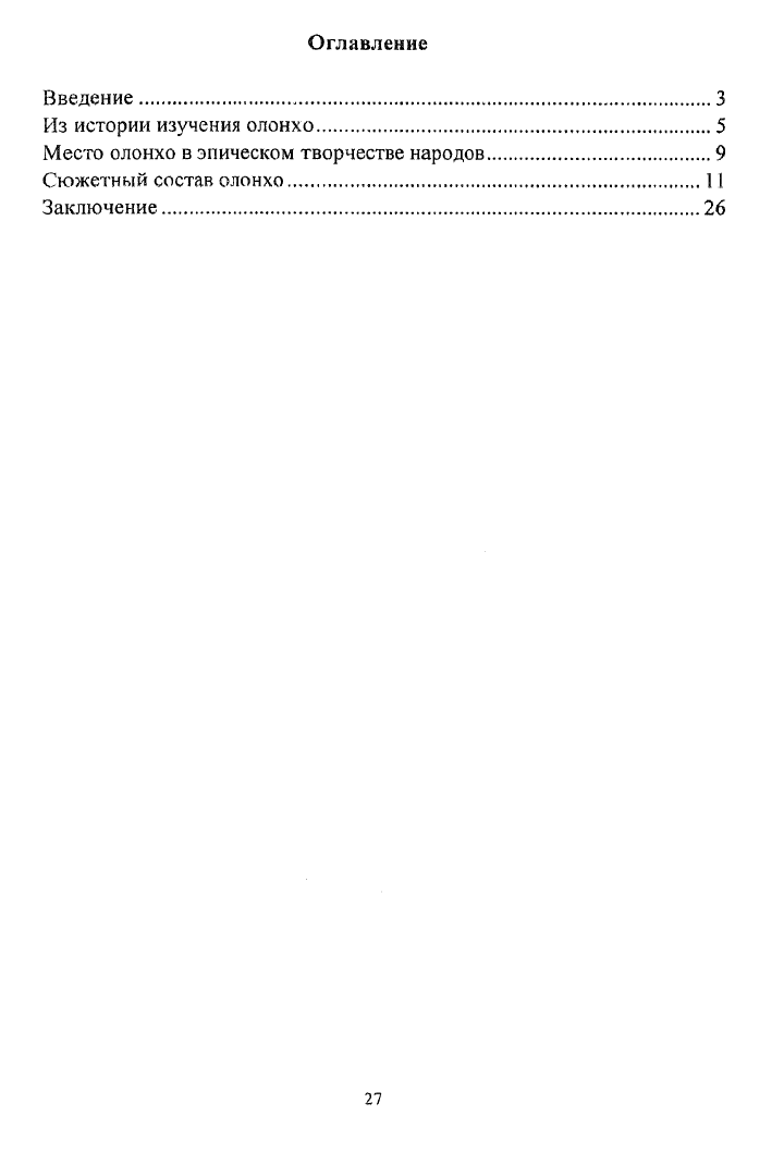 В пособии кратко характеризуются эволюция развития сюжетики героического эпоса саха - олонхо, процесс постепенного изменения их эпической конфликтной ситуации от внутриродовых противоречий до межплеменных в период становления этноса саха ураангхай (древнее самоназвание саха), связь сюжетного движения олонхо с этническим самосознанием создателей эпоса и соотношение олонхо с жанром исторических преданий