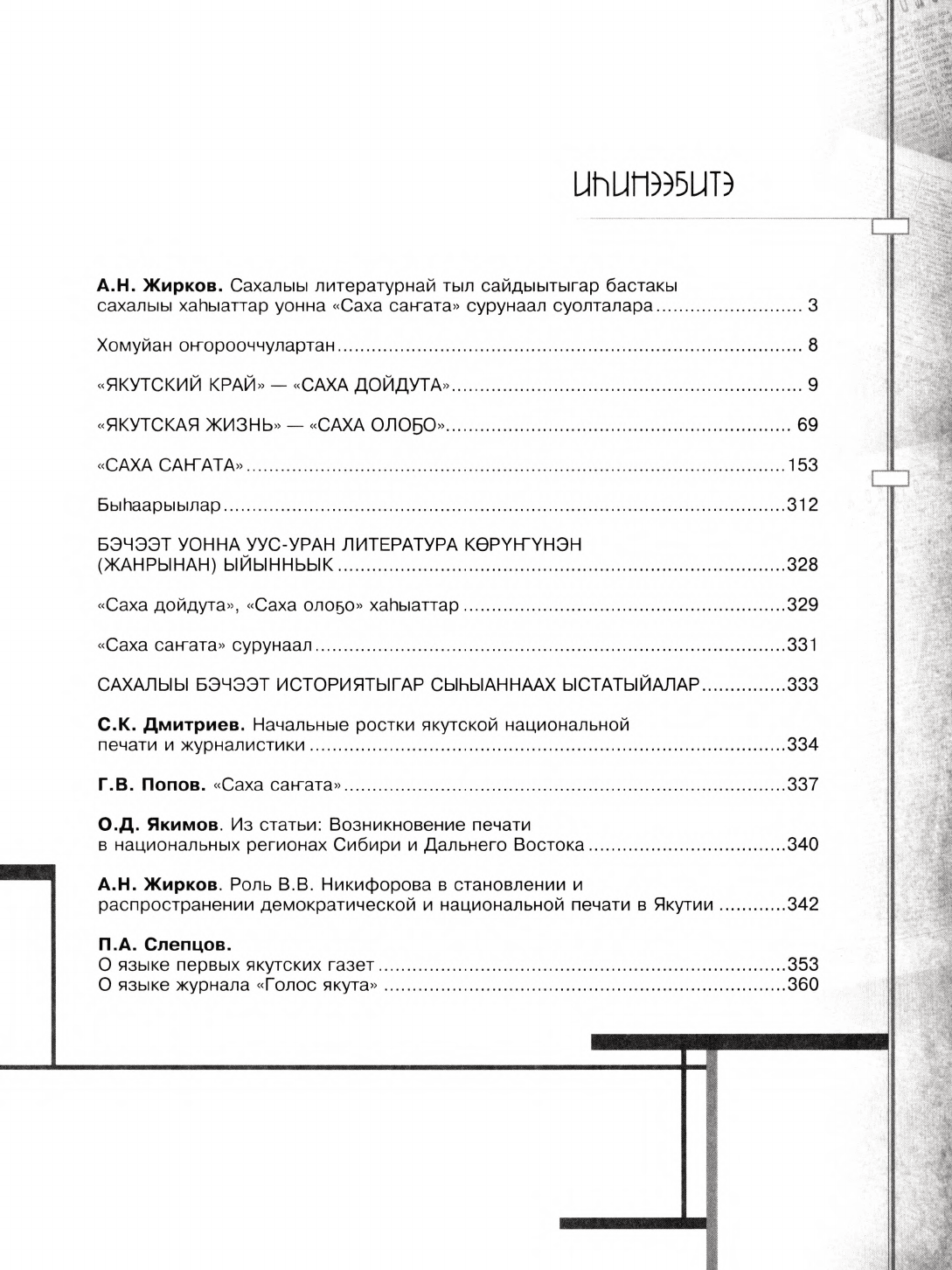 Сахалыы бастакы хаһыаттар, сурунаал : Саха дойдута (1907-1908), Саха олоҕо (1908-1909), Саха саҥата (1912-1913) / М. К. Аммосов аатынан Хотугулуу-Илиҥҥи федер. ун-т, Саха Өрөспүүбүлэкэтин нац. библиотеката ; [хомуйан оҥордулар: Н. В. Бурцева, А. Н. Жирков, В. Г. Семенова ; редкол.: М. К. Илларионова, А. Н. Жирков (бырайыак ааптара, салайааччыта), П. П. Петров уо.д.а.]. - Дьокуускай, 2017 (Владивосток : Дальпресс). - 365, [2] с.