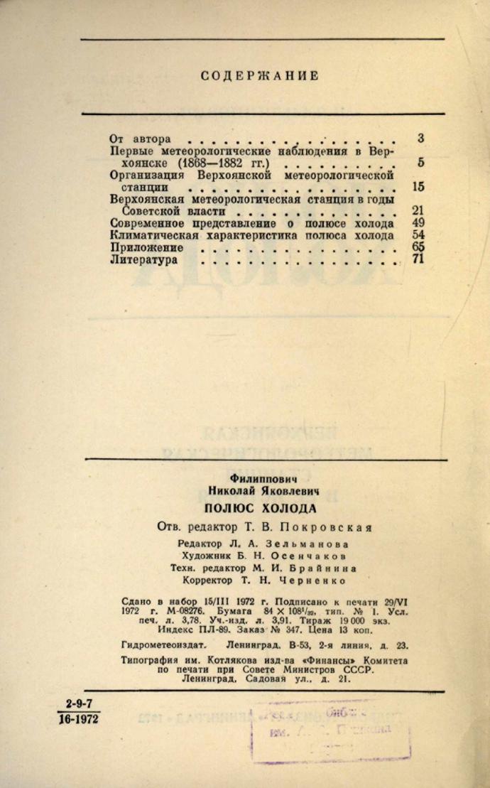 Полюс холода : Верхоянская метеорологическая станция и ее история / Н. Я. Филиппович. - Ленинград : Гидрометеоиздат, 1972. - 71, [1] с.