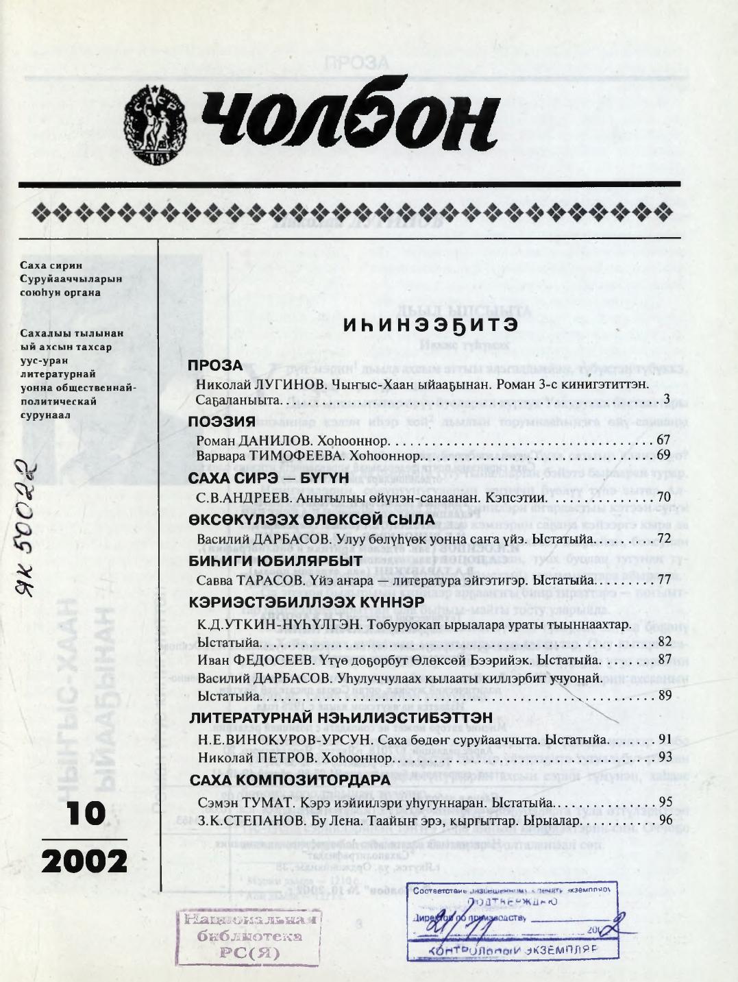 - 2. Чолбон: уус-уран литературнай уонна общественнай-политическай сурунаал, 2002, №2