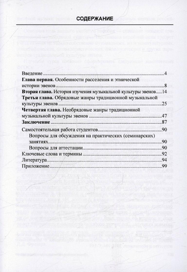 Данное пособие является первым отдельным учебным изданием, посвященным традиционной музыкальной культуре эвенов, ее жанрам и формам бытования, основным особенностям. Оно оснащено учебно-методическими материалами, нотными образцами и фотоиллюстрациями, рекомендованным списком литературы, контрольными вопросами, темами для семинарских занятий, вопросами для аттестации, понятийным аппаратом и т.д.