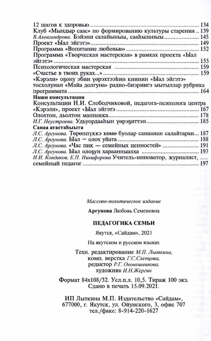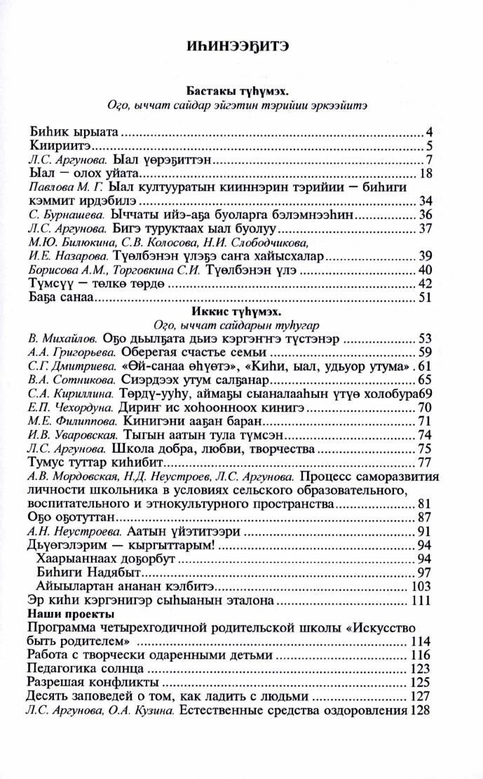Ыал үөрэҕиттэн / Л. С. Аргунова ; Төрөппүтү иитиигэ Дьокуускайдааҕы ыал култууратын киинэ, "Мин — Эйгэбин" педагогическай мастарыскыай. - Дьокуускай : Сайдам, 2021. - 200 с.