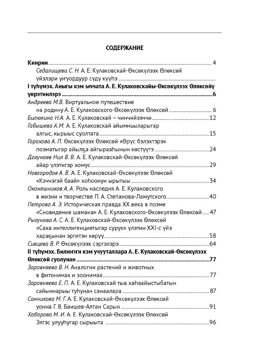 Наследие А. Е. Кулаковского-Өксөкүлээх Өлөксөй в краеведении Якутии : сборник статей и материалов участников Республиканской краеведческой конференции, посвященной 145-летию А. Е. Кулаковского-Өксөкүлээх Өлөксөй, 6–7 апреля 2022 года / Министерство образования и науки Республики Саха (Якутия), Академия наук Республики Саха (Якутия), Научно-образовательный центр ; составитель, предисловие С. Н. Седалищева. - Якутск : ИЦ НБ РС (Я), 2023. - 1 файл (104, [1] с. ; 6 мб). - (Сборники конференции школьников).